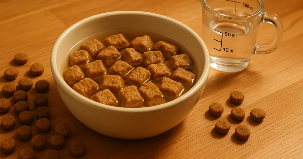 Rehydration is important: Feeding dehydrated food dry is convenient but suboptimal. Rehydration with warm water restores palatability, aids digestibility, and ensures the dog gets adequate moisture from the meal — particularly important for dogs that don’t drink enough independently.
