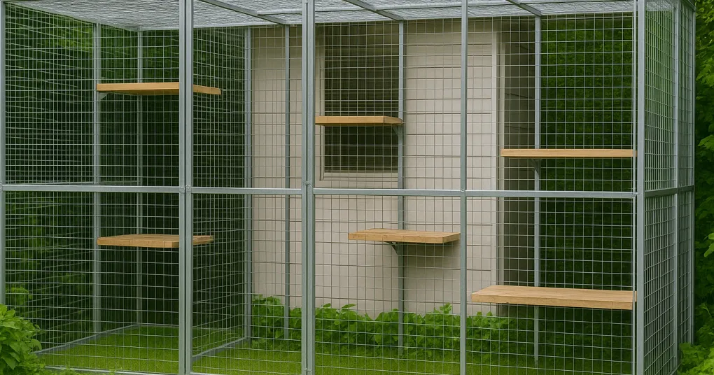 - Effective predator exclusion requires: (1) 14-gauge or heavier galvanized wire mesh with 1/2-inch openings to exclude raccoons (which can squeeze through 4-inch gaps); (2) A full roof — open-top enclosures do not protect against hawks and great horned owls, which can take adult cats; (3) A secure door latch that cannot be manipulated by raccoons. Kittywalk and lightweight nylon-mesh enclosures are not suitable for unattended use in areas with raccoon, coyote, or large bird of prey populations.