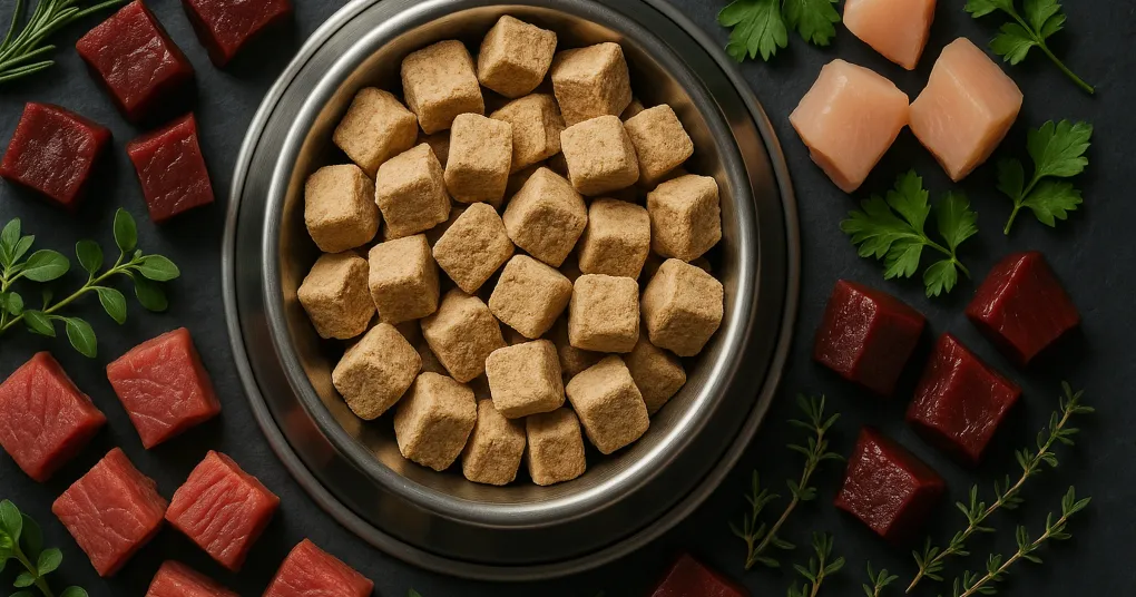 Primal Pet Foods is a preferred brand among committed raw feeders — owners who have researched and committed to a full raw diet rather than freeze-dried as a convenience compromise. Primal’s frozen nuggets are formulated with whole proteins, ground bone, organ meats, and organic produce, meeting AAFCO “complete and balanced for all life stages” without synthetic vitamin/mineral supplements added at the end of the process.