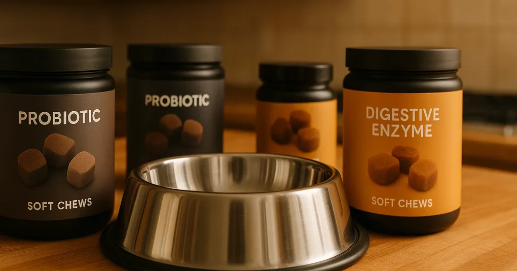 Probiotic strain specificity: Not all probiotics are equally studied. Enterococcus faecium SF68 (the strain in FortiFlora) has the strongest canine evidence base. Lactobacillus acidophilus and multi-strain blends have supporting evidence. Look for stated CFU counts and specific strain names rather than generic “probiotic blend” language.